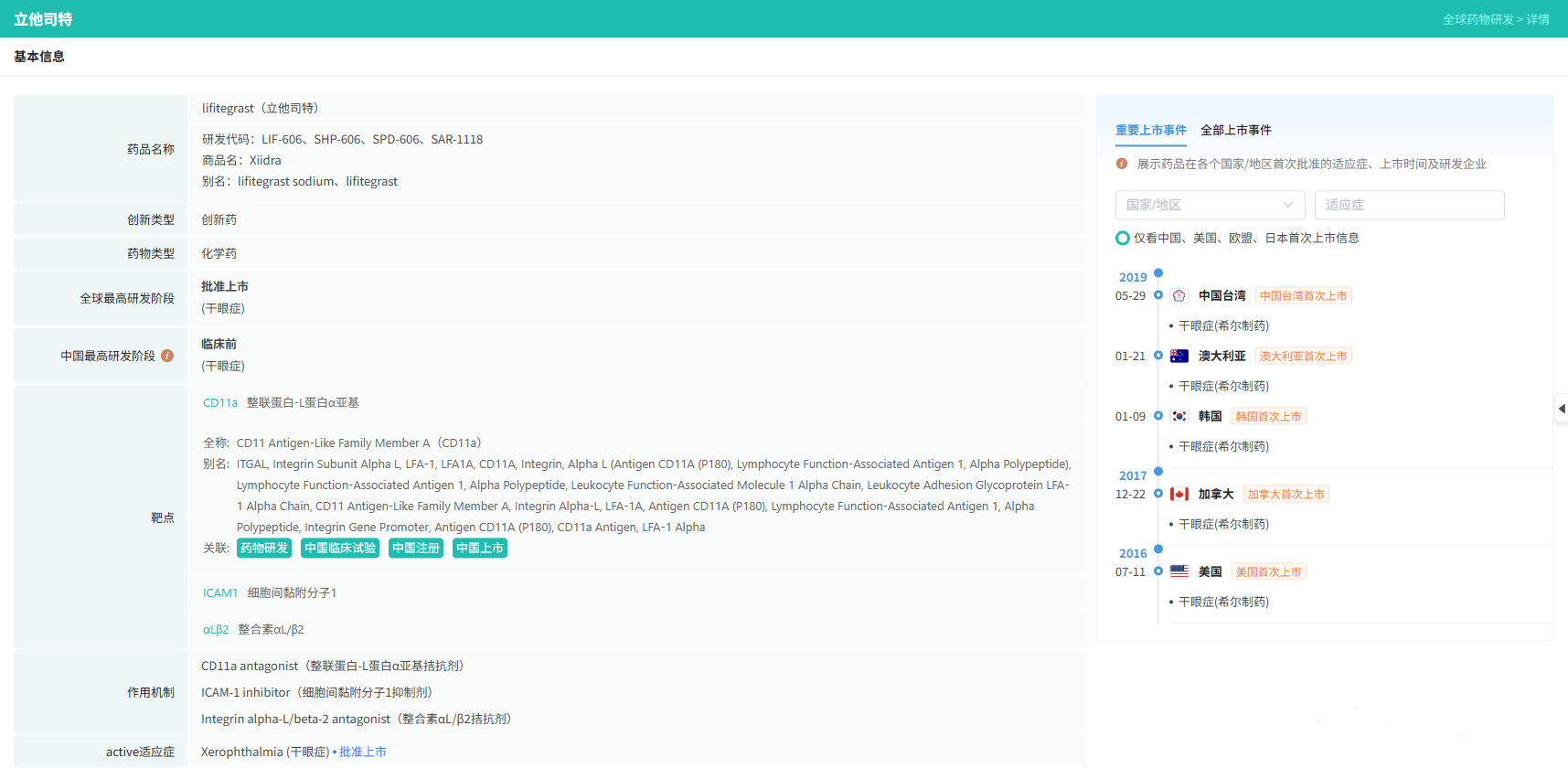 利非司特滴眼液原研为美国Shire Dev LLC(后被诺华收购)开发的第一代淋巴细胞功能相关抗原-1(LFA-1)拮抗剂,是全球首个获批治疗干眼症(DED)体征和症状的LFA-1拮抗剂类处方药,商品名为Xiidra®,于2016年7月在美国正式获批上市,曾创下年销售额超10亿美元的纪录。2023年12月,该药被列入国家卫健委《第三批鼓励仿制药品目录》,政策红利下,康弘药业率先突破技术壁垒,成为国内首家获批企业。