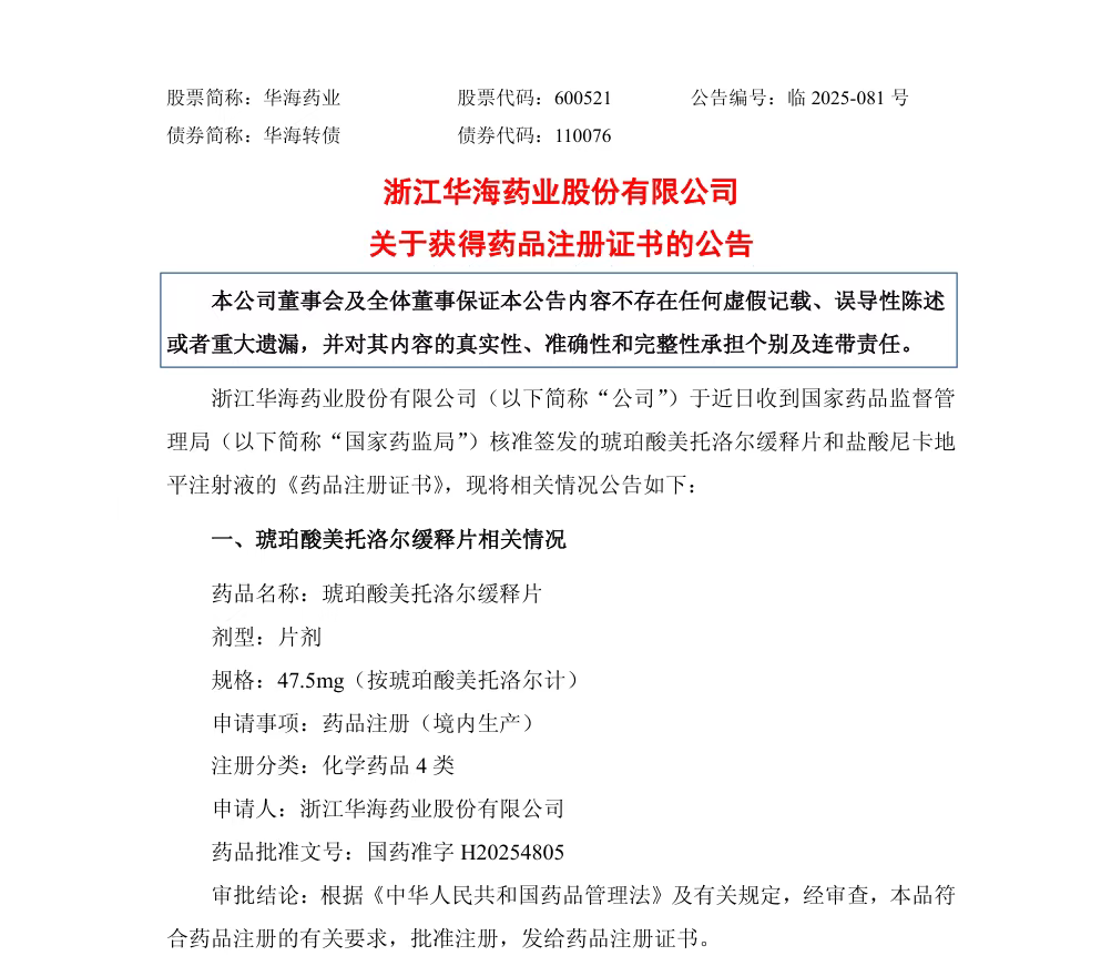 7月11日,浙江华海药业股份有限公司(股票代码:600521)宣布,其自主研发的琥珀酸美托洛尔缓释片盐酸尼卡地平注射液正式获得国家药品监督管理局(NMPA)颁发的《药品注册证书》。这一消息不仅标志着华海药业在心血管药物领域的研发实力再上新台阶,更预示着国内高血压、心绞痛及手术高血压急症治疗市场将迎来新的竞争格局。