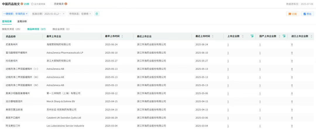 据摩熵医药数据统计,2025年以来,华海药业已有17款产品获批上市,其中5款为高血压用药,形成“老药新批+首仿突破”的组合拳。