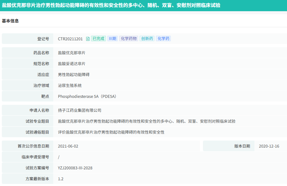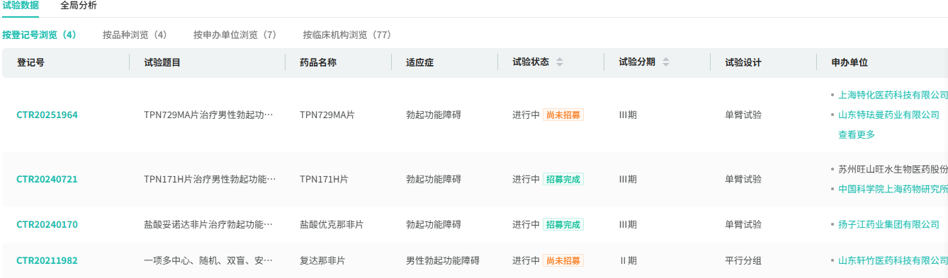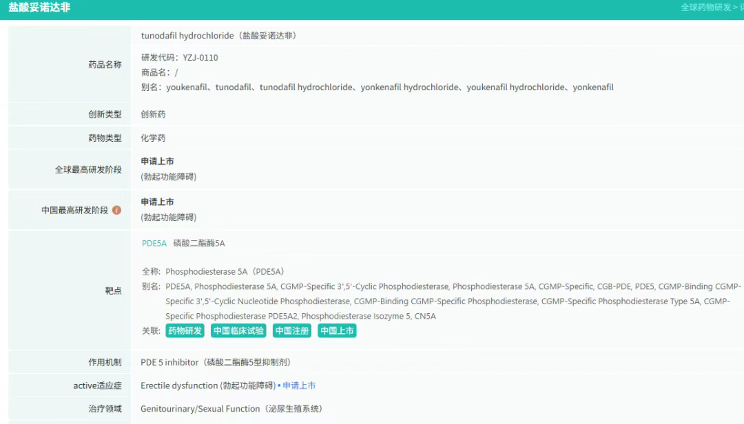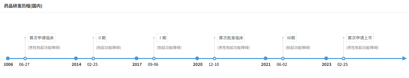 据摩熵医药数据显示,该药由吉林大学、天津倍方与天士力、扬子江药业合作研发。最早于2006年申请临床,2023年2月首次申报上市,并于昨日(7月25日)顺利获批上市,成为国内第3款国产1类抗ED新药。