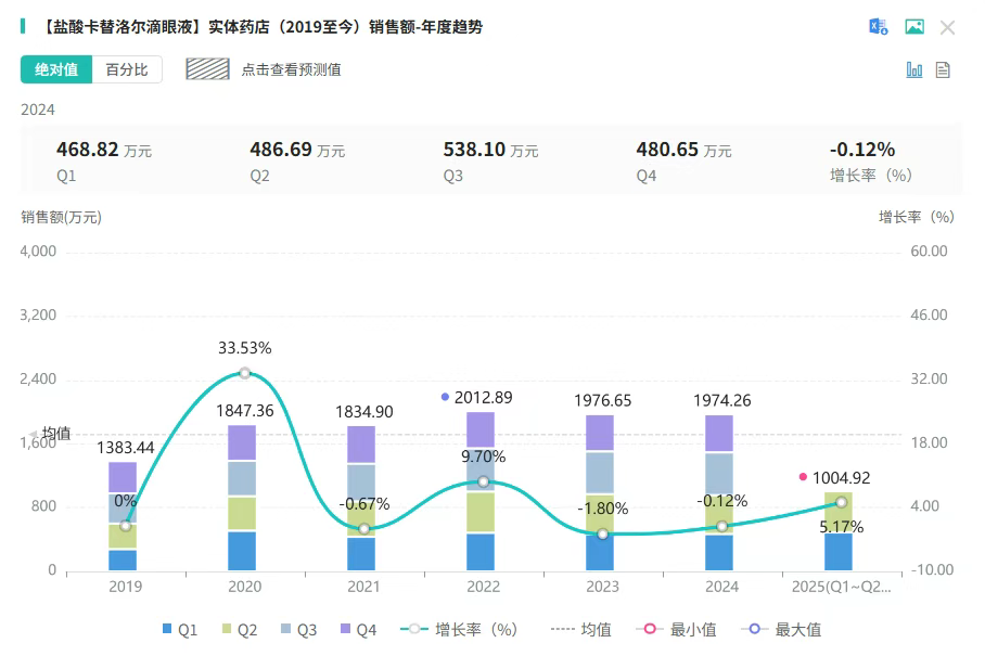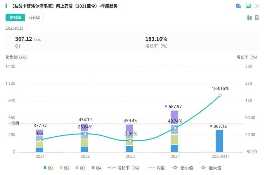 据摩熵医药数据库显示,盐酸卡替洛尔滴眼液在2024年全终端医院的销售额达5423万元,实体药店销售额近2000万,网上药店的销售额也在逐年增长中,2025年Q1季度的销售额就已突破360万元,超过了去年上半年网上药店的销售额总和,增长率更是达到了183.16%,市场潜力不容小觑。