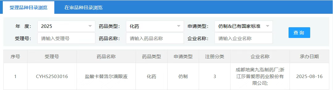 8月15日,国家药品监督管理局药品审评中心(CDE)官网显示,成都地奥九泓制药厂与浙江莎普爱思药业股份有限公司提交的盐酸卡替洛尔滴眼液4类仿制申请已获受理,意味着国内青光眼治疗领域首仿争夺战正式打响。作为国内唯一原研独家品种,盐酸卡替洛尔滴眼液年销售额超五千万元,其仿制开发不仅关乎企业战略布局,还将重塑抗青光眼药物市场格局。
