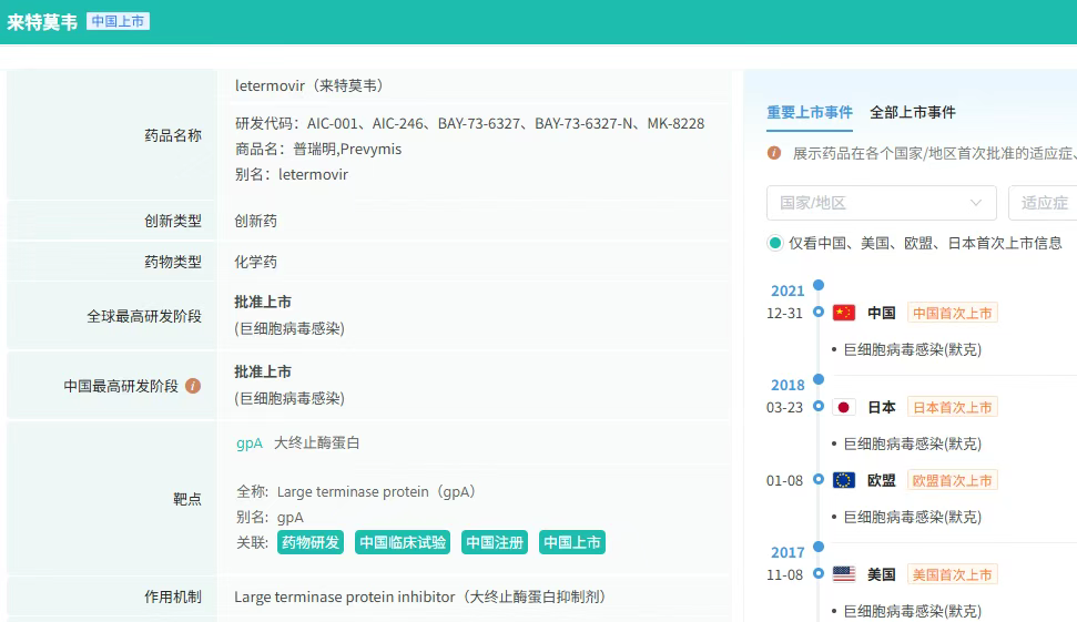 该药物的原研权益由默沙东通过旗下子公司从AiCuris公司收购获得。来特莫韦片剂和注射剂最早于2017年获美国FDA批准上市,2022年先后获批进入国内市场,商品名为Prevymis(普瑞明)。