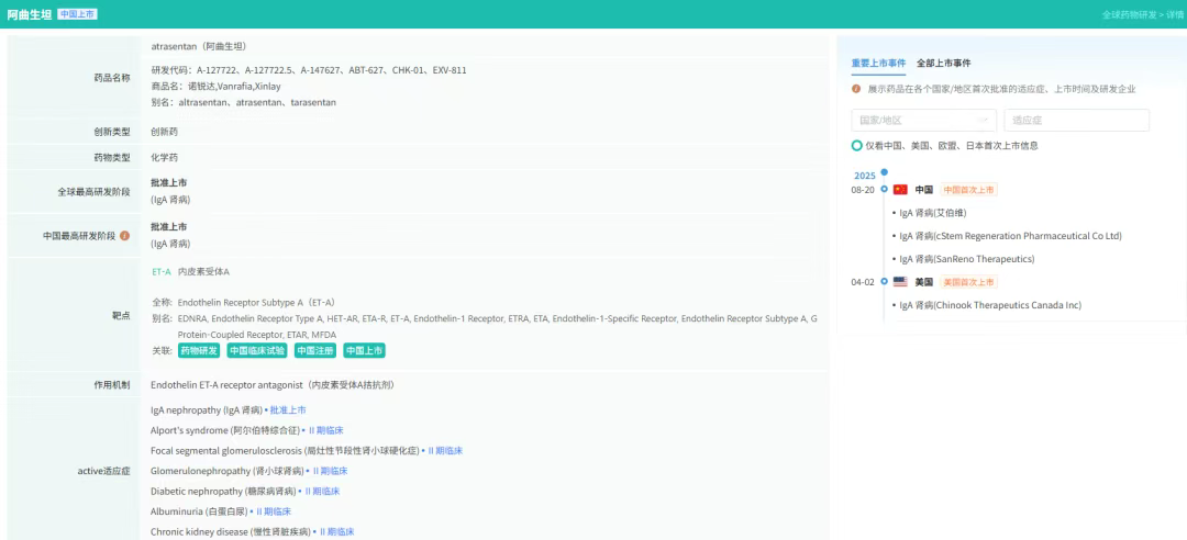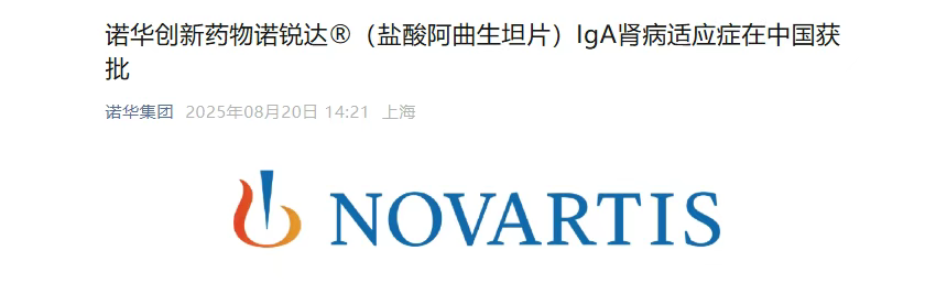 8月20日,诺华公司宣布其创新产品盐酸阿曲生坦片(诺锐达®)正式获得国家药品监督管理局(NMPA)批准,用于降低有疾病进展风险的原发性免疫球蛋白A肾病(IgAN)成人患者的蛋白尿。这一适应症此前已被国家药品监督管理局药品审评中心(CDE)纳入优先审评,是诺华在肾脏疾病治疗领域的又一重要突破。