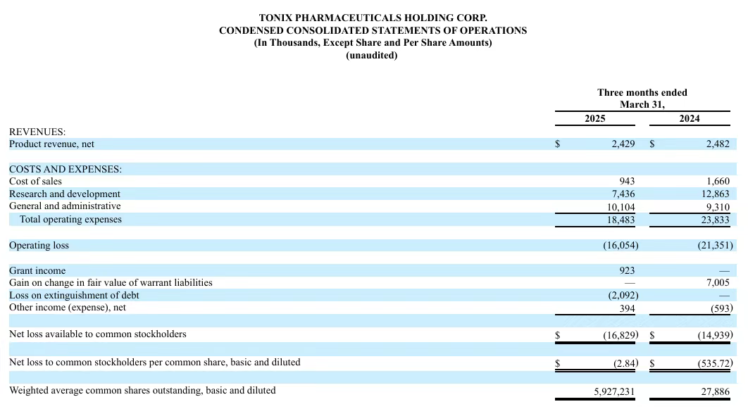 2024年度,Tonix Pharmaceuticals产品净收入为1010万美元,全年销售成本为780万美元,研发费用为4000万美元,一般和行政费用为4010万美元。2025年第一季度产品净收入240万美元;研发费用为740万美元,上年同期为1290万美元,这一下降主要是由于临床、非临床、制造和员工相关费用的减少;销售、一般及行政费用为1010万美元,上年同期为930万美元,这一增长主要归因于销售和营销费用的增加;净亏损1680万美元,上年同期亏损1490万美元。
