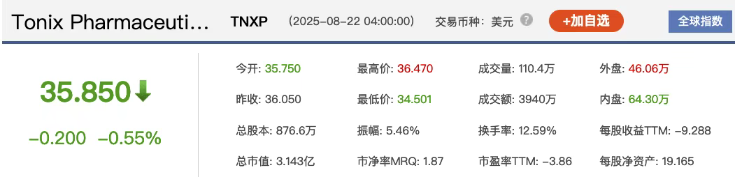 当前Tonix Pharmaceuticals专注于中枢神经系统、免疫学、传染病领域。截止2025年8月发稿前,公司市值约3.143亿美元。