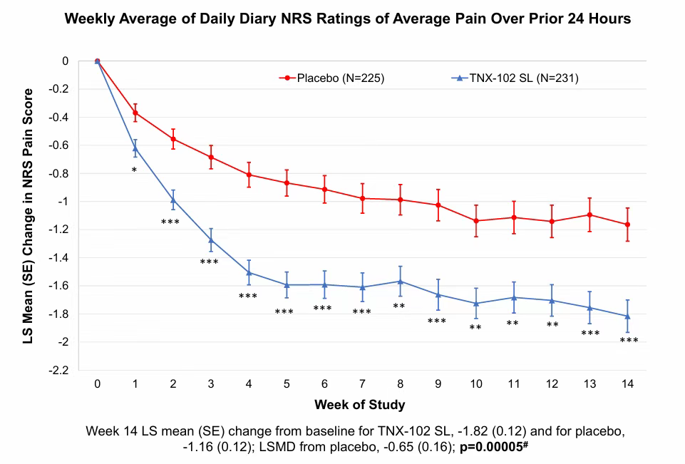 新药上市申请NDA基于两项为期14周的双盲、随机、安慰剂对照临床试验3期研究,主要评估TNX-102 SL作为纤维肌痛症睡前治疗方案的安全性和有效性。首项RELIEF试验于2020年12月完成,评估了TNX-102 SL 5.6 mg在纤维肌痛症中的疗效,该试验达到了预先设定的主要终点,即与安慰剂相比显著减轻每日疼痛(p=0.010);在2023年12月完成的RESILIENT试验中,TNX-102 SL再次达到预先设定的主要终点,与安慰剂相比显著减轻每日疼痛(p=0.00005)。在两项试验中,TNX-102 SL总体耐受性良好,不良事件谱与先前研究相当,且未观察到新的安全信号。