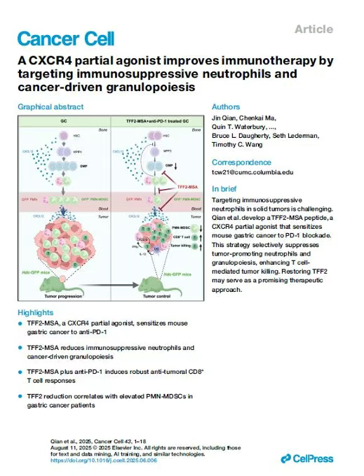 另一个临床前研究阶段的候选产品TNX-1700是一种rTFF2-HSA融合蛋白,通过“CXCR4部分激动+靶向MDSC”这一全新免疫调节机制,在多种消化道肿瘤模型中显著增强抗PD-1疗效。近期发表的文章显示,与单独抗PD1治疗相比,mTNX-1700(鼠源版本TNX-1700)与抗PD1抗体联合治疗与胃癌动物模型的生存率增加和转移减少相关;mTNX-1700治疗与杀伤癌症的CD8 T细胞的激活和限制中性粒细胞介导的免疫逃逸有关。
