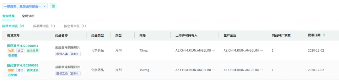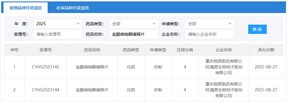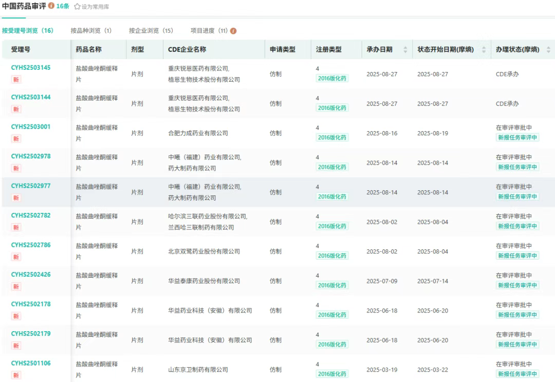 8月27日,CDE官网显示,重庆锐恩医药与植恩生物按4类化药联合申报的盐酸曲唑酮缓释片上市申请已获受理。摩熵医药数据库显示,该剂型在国内暂无药企获批,当前共15家企业参与首仿角逐,积极布局百亿抗抑郁市场。