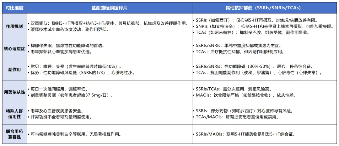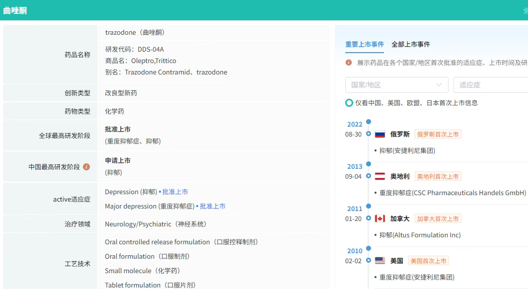 盐酸曲唑酮(trazodone)是5-羟色胺(5-HT)受体拮抗剂和5-HT再摄取抑制剂(SARIs)类药物,兼具镇静和抗焦虑作用,主要用于治疗抑郁症和伴随抑郁症状的焦虑症以及药物依赖者戒断后的情绪障碍。