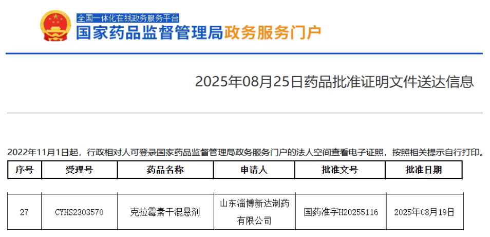 近日,国家药监局(NMPA)官网显示,新华制药子公司山东淄博新达制药有限公司申报的克拉霉素干混悬剂获批上市,视同过评。据摩熵医药数据库显示,新华制药是该产品国产第三家获批企业,并拿下首家过评!