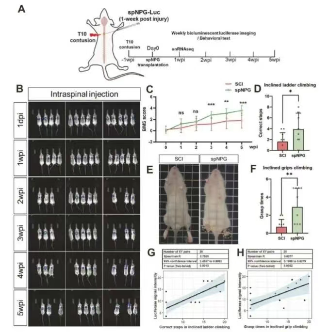 更重要的是,研究人员发现:脊髓损伤动物模型运动功能恢复程度,与spNPG的存活量呈显著正相关(正确步数与荧光强度的相关系数R=0.7525,p=0.0013),这意味着,存活的spNPG越多,治疗效果越好,直接证明了spNPG是功能恢复的“关键因素”。