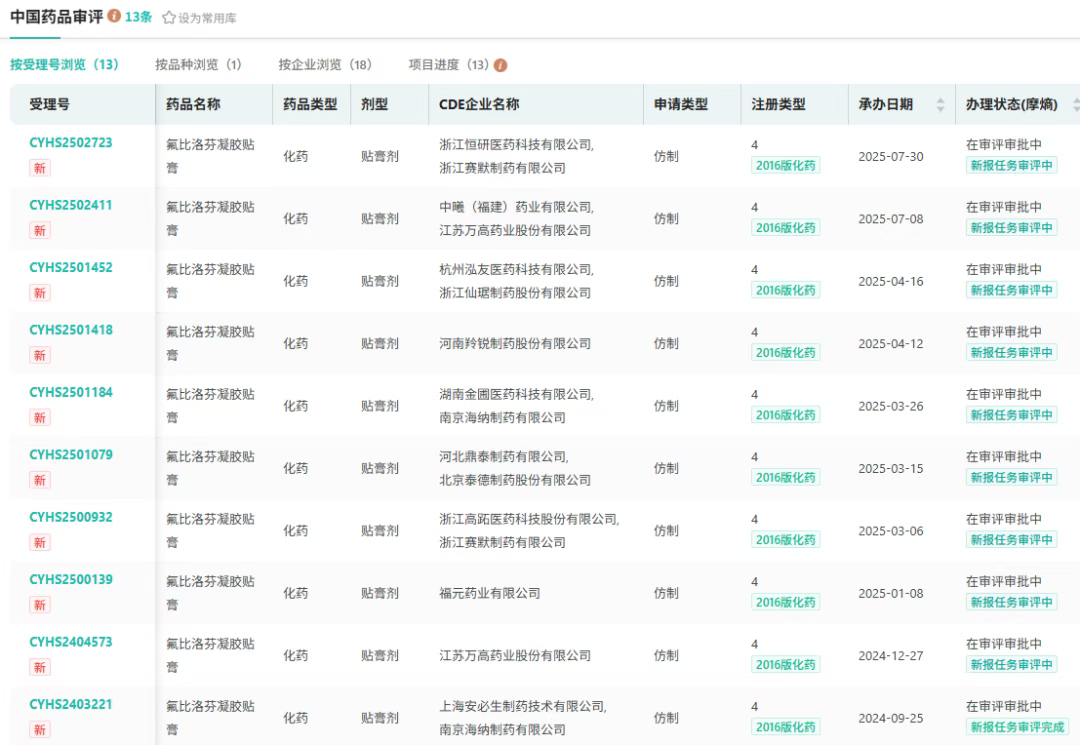 据摩熵医药数据,在贴膏剂产品排名中,氟比洛芬凝胶贴膏近年来稳居首位,面对如此广阔的市场,国内众多制药企业都心动不已,积极展开布局。