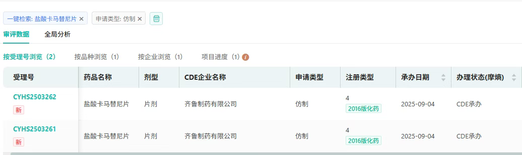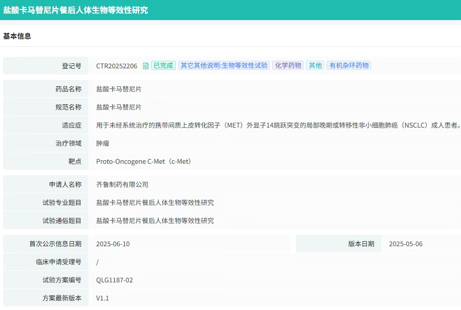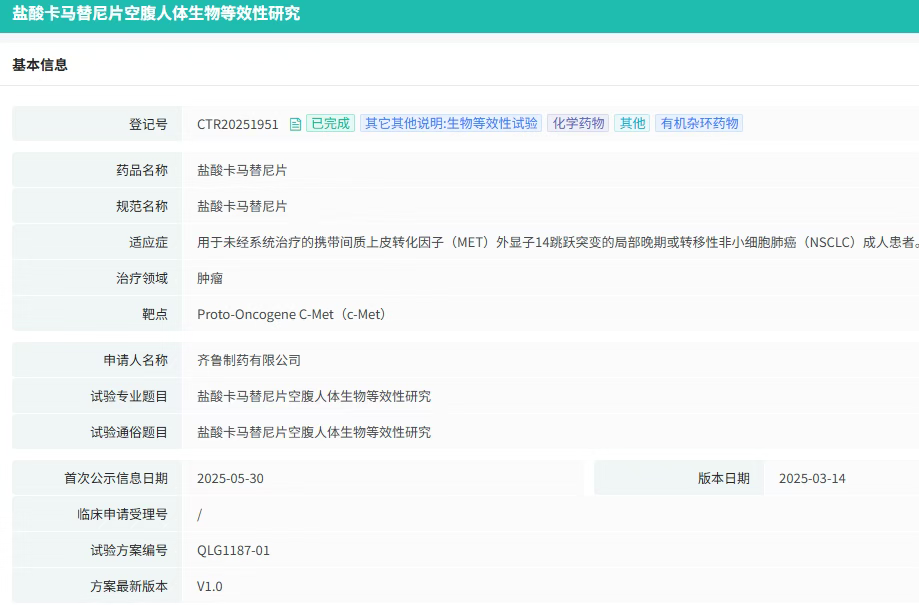 9月4日,CDE官网显示,齐鲁制药有限公司按4类化药注册申报的盐酸卡马替尼片上市申请已获受理。作为MET驱动型肺癌精准治疗的里程碑药物,该药品目前国内仅原研上市,若齐鲁制药顺利获批,或将成为国内首仿。