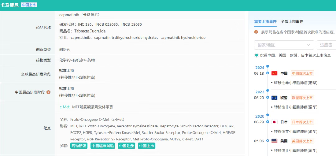 卡马替尼(Capmatinib)是全球首个获批的口服生物利用度高、高选择性的MET受体酪氨酸激酶抑制剂。该药的研发始于Incyte公司,诺华(Novartis)于2009年获得其研发和推广许可。