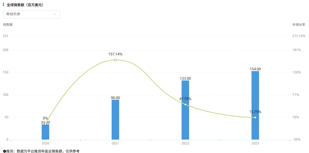 据摩熵医药数据库显示,该药全球销售额逐年攀升:2021年为9000万美元,同比大涨157.14%;2022年突破至1.33亿美元,同比增长47.78%,2023年再创新高,达到1.54亿美元,市场规模稳步扩大。