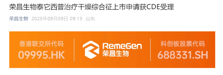 刚刚,荣昌生物宣布,其公司自主研发的全球首创BLyS/APRIL双靶点融合蛋白创新药泰它西普(商品名:泰爱®)用于治疗干燥综合征(Sjogren's syndrome)的上市申请,已获国家药品监督管理局药品审评中心(CDE)正式受理,成为干燥综合征领域全球首个申请上市的生物药。
