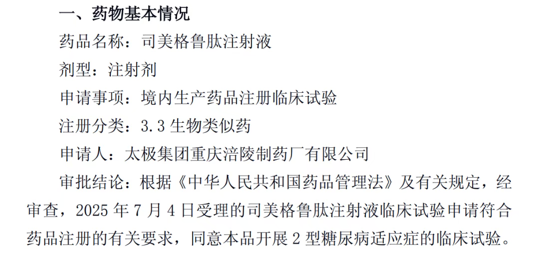刚刚,太极集团发布公告,全资子公司太极集团重庆涪陵制药厂有限公司(涪陵制药厂)收到国家药品监督管理局关于司美格鲁肽注射液的《药物临床试验批准通知书》。