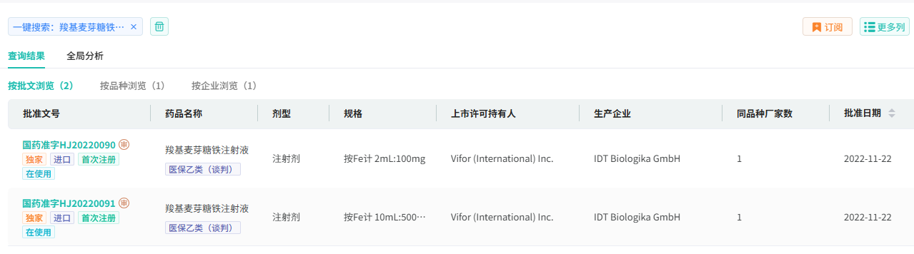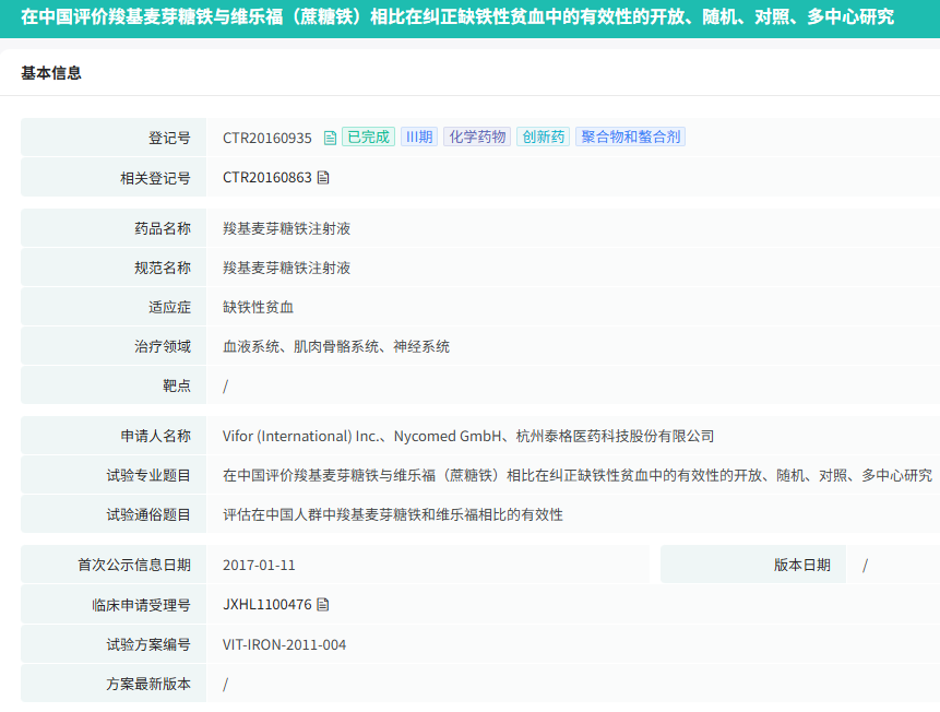 2022年11月,由杭州泰格医疗科技引进的羧基麦芽糖铁原研药在中国上市,商品名为“菲新捷”。上市规格为500mg/10ml 和100mg/2ml,以适配不同临床用药需求。