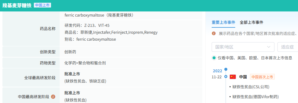 羧基麦芽糖铁注射液由维福制药(Vifor Pharm)原研,2007年6月率先在德国上市,2013年7月于美国获批,目前已在包括英国、瑞士等在内的80多个国家或地区上市。