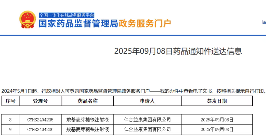9月8日,NMPA发布的药品通知件送达信息中,多个产品未被批准,仁合益康集团的羧基麦芽糖铁注射液赫然在列。该产品在国内仅原研上市,仁合益康成为继先声药业之后,第二家冲击上市失败的企业。首仿花落谁家,尚未可知。