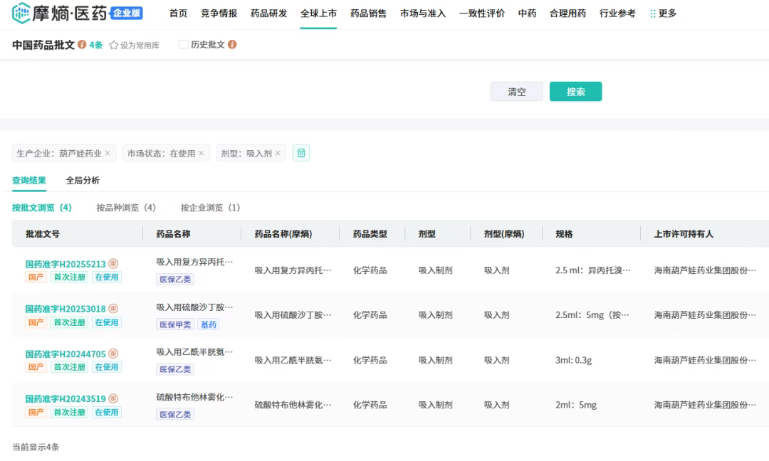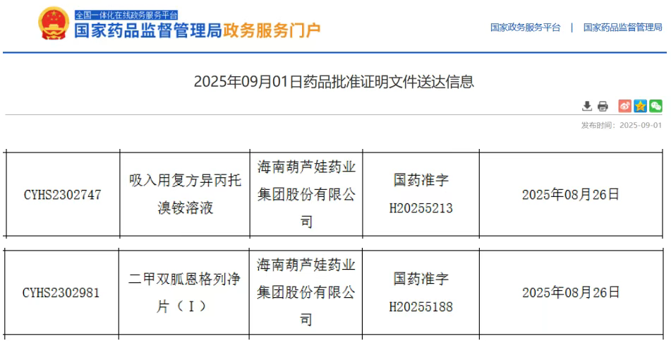 近日,据NMPA官网最新显示,海南葫芦娃药业提交的两款4类仿制药吸入用复方异丙托溴铵溶液和二甲双胍恩格列净片(Ⅰ)同日获批并视同通过一致性评价。截至目前,葫芦娃药业在吸入剂领域拥有4款产品生产批文,研发转化效率与市场拓展速度持续领跑行业。
