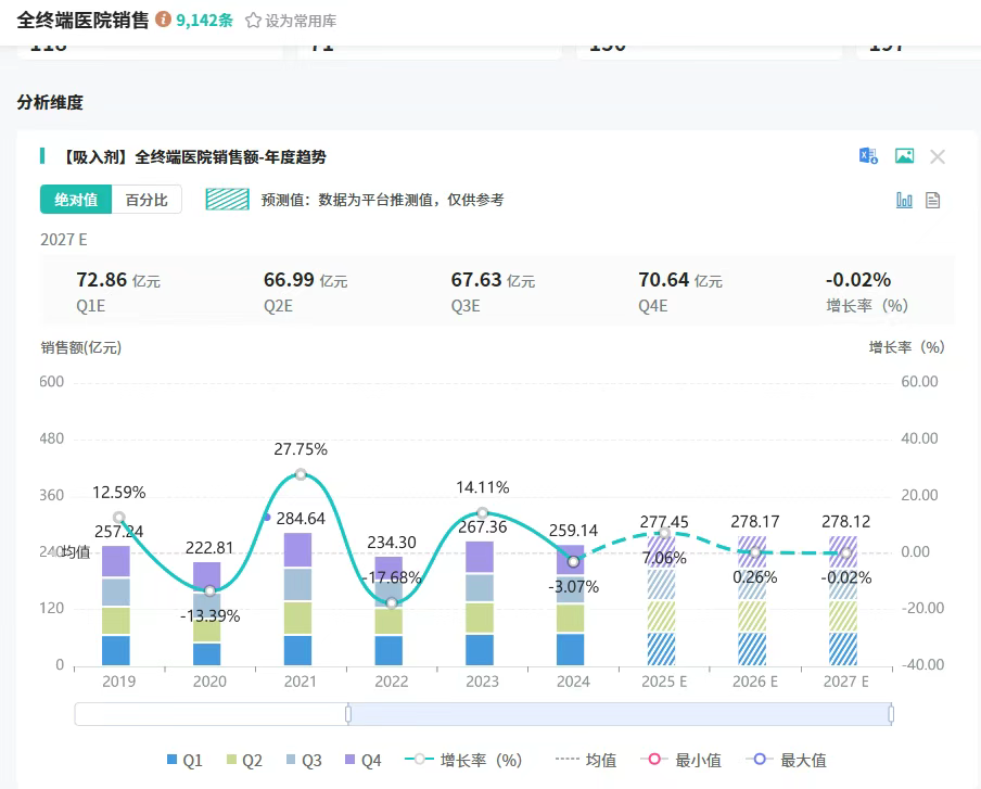 吸入用复方异丙托溴铵溶液由勃林格殷格翰开发,该药品是《国家基本医疗保险、工伤保险和生育保险药品目录(2024年版)》乙类药品,适用需要多种支气管扩张剂联合应用的患者,用于治疗气道阻塞性疾病有关的可逆性支气管痉挛。据摩熵医药数据库显示,吸入用复方异丙托溴铵溶液在2024年全终端医院销售额超2亿元。