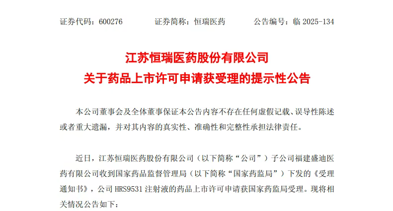 9月1日,恒瑞医药发布公告,称其子公司福建盛迪医药有限公司自主研发的GLP-1R/GIPR双靶点激动剂HRS9531的药品上市申请,已获国家药监局受理。目前,全球范围内获批上市的GLP-1/GIP双受体激动剂仅有礼来的替尔泊肽,恒瑞医药凭借HRS9531 III期临床的全面成功,正式向这一市场霸主发起挑战。