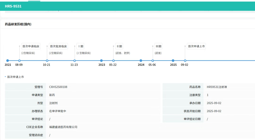 HRS9531此次提交上市申请,拟定适应症为在控制饮食和增加运动基础上,初始体重指数(BMI)符合特定要求的成人的长期体重管理,即BMI≥28 kg/m²(肥胖),或≥24 kg/m²(超重)并伴有至少一种体重相关合并症(例如高血糖、高血压、血脂异常、阻塞性睡眠呼吸暂停、脂肪肝等)。