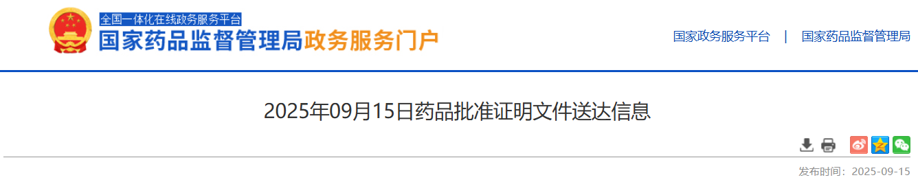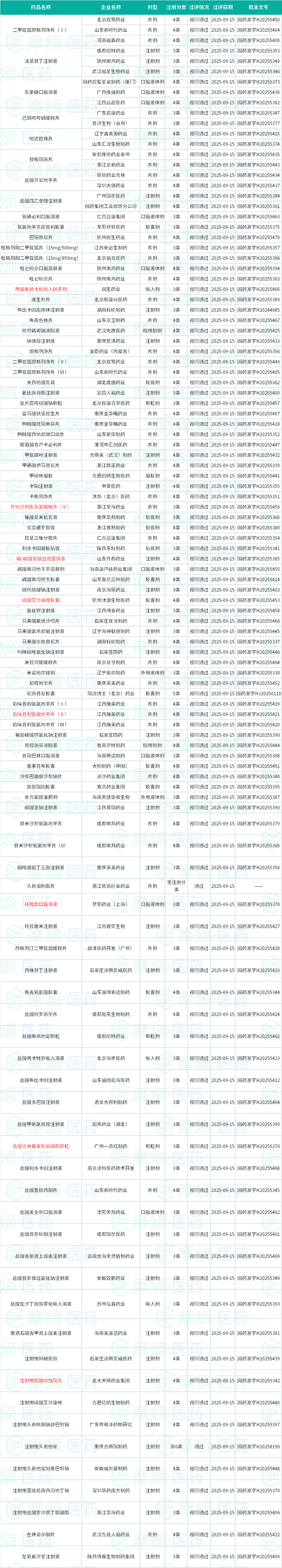 据NMPA官网,2025年9月15日发布的药品批准证明文件送达信息,99个品种(140品规)通过/视同通过一致性评价,涉及山东新时代、成都倍特药业等多家药企。
