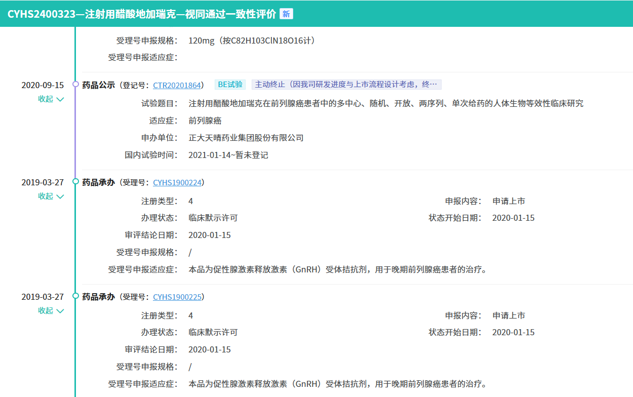 9月15日,据NMPA官网最新显示,正大天晴提交的4类仿制药注射用醋酸地加瑞克获批上市,用于需接受雄激素去势治疗的前列腺癌患者。此前,该产品在国内外市场一直被原研药“独占”,据摩熵医药数据库显示,目前,在国内暂无其他药企递交地加瑞克仿制药上市申请,正大天晴成为了国内首个“吃螃蟹”的药企,成功打破了原研的垄断局面。
