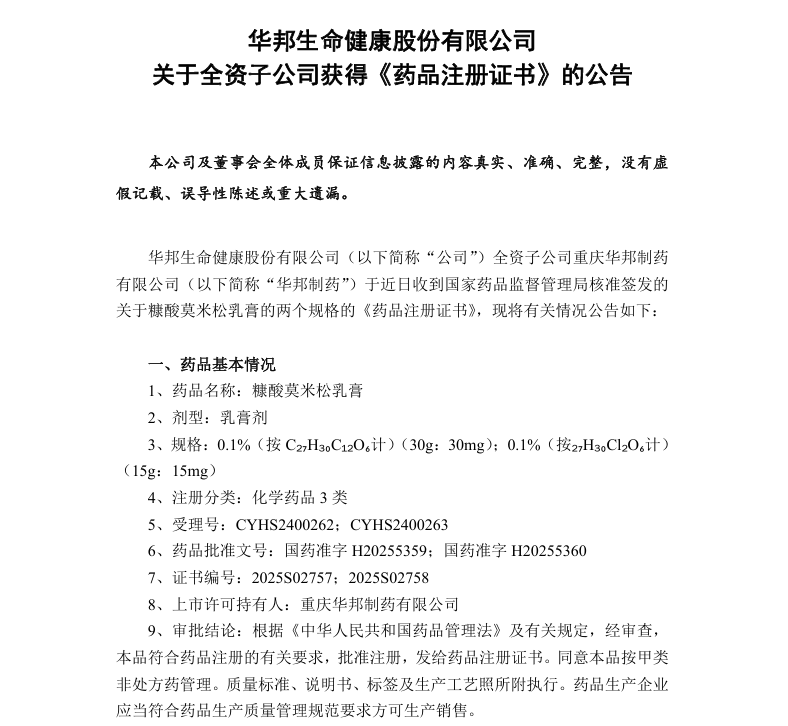 此次,重庆华邦制药的糠酸莫米松乳膏成功获批,不仅进一步优化了公司丰富的产品管线布局,更为广大皮炎湿疹、皮肤瘙痒患者带来了更多优质、可靠的用药新选择。