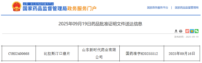 9月19日,据NMPA官网最新公示,鲁南制药集团子公司山东新时代药业按化药注册分类3类申报的比拉斯汀口崩片(规格:20mg)获批上市,该剂型为国内首仿。