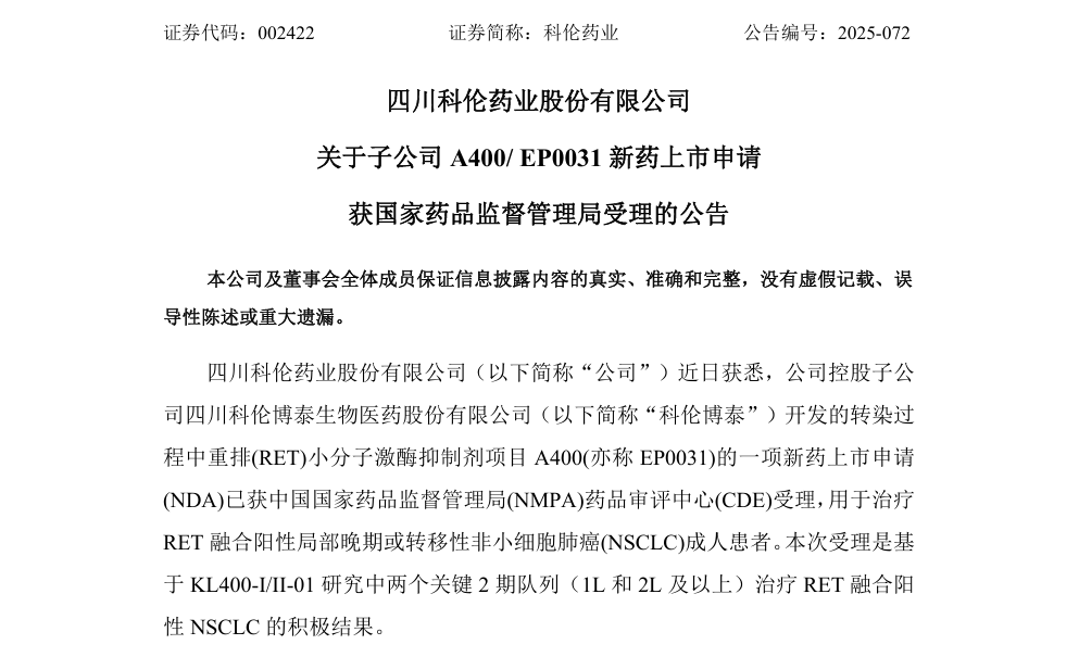 9月23日,科伦药业发布公告,其控股子公司科伦博泰提交的1类新药富马酸仑博替尼胶囊的上市申请,已获国家药品监督管理局药品审评中心(CDE)受理。该药物将用于治疗RET融合阳性局部晚期或转移性非小细胞肺癌(NSCLC)的成人患者。