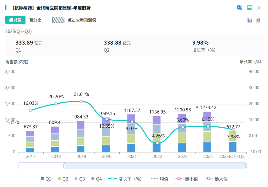 近年来,抗肿瘤药市场呈现出蓬勃发展的态势。随着越来越多的创新药获批上市并实现销售,叠加临床刚需属性的拉动,抗肿瘤药(化学药或生物药)在全终端医院的销售额逐年上涨。据摩熵医药数据库显示,2024年,抗肿瘤药在全终端医院的销售额超1200亿元,同比增长达6.15%。