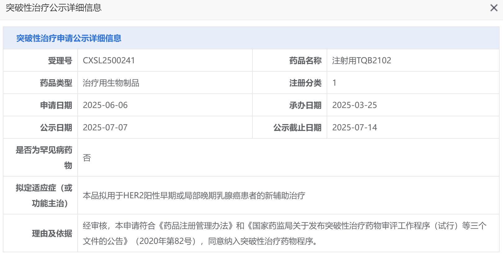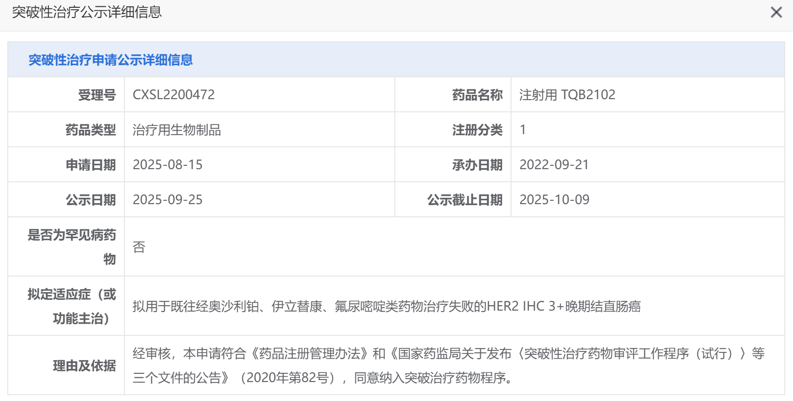 据摩熵医药数据库显示,在今年7月,TQB2102用于HER2阳性早期或局部晚期乳腺癌患者的新辅助治疗的适应症已成功纳入突破性疗法。