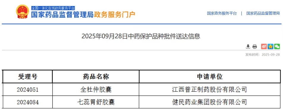 9月28日,国家药监局发布最新中药保护品种公告,为中药市场投下一颗“重磅炸弹”——江西普正制药的全杜仲胶囊、健民药业的七蕊胃舒胶囊,双双获批为首家中药二级保护品种。这意味着这两款独家中成药,将在保护期内享受市场独占权,其他企业不得仿制,市场前景一片光明。