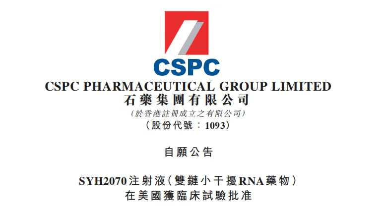 10月9日,石药集团(1093.HK)宣布,本集团自主研发的化学1类新药SYH2070注射液(双链小干扰RNA(siRNA)药物)(下称:该产品)已获得美国食品药品监督管理局(FDA)批准,可在美国开展临床试验。该产品亦于2025年9月获得中华人民共和国国家药品监督管理局批准在中国开展临床试验。