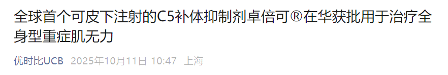 10月11日,全球生物制药公司优时比(UCB)宣布,中国国家药品监督管理局(NMPA)已批准泽卢克布仑钠(商品名:卓倍可)上市许可,与常规治疗药物联合用于治疗抗乙酰胆碱受体(AChR)抗体阳性的成人全身型重症肌无力患者。