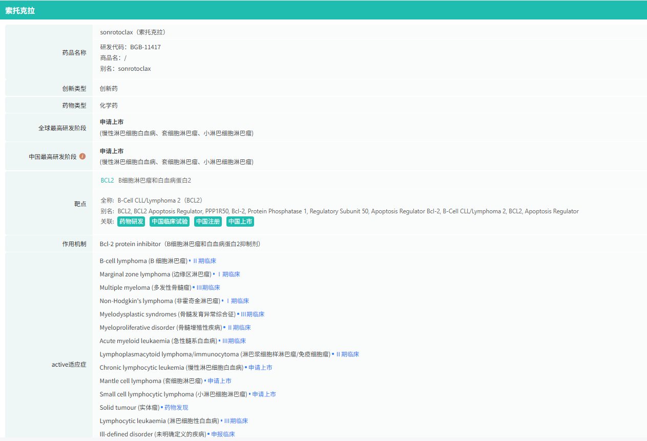 索托克拉是一款新一代且具有同类最优潜力的在研B细胞淋巴瘤2(BCL2)抑制剂,BCL2是帮助肿瘤细胞存活的几种蛋白质之一。索托克拉类属BH3类似物,可模拟自然细胞死亡信号。实验室和早期药物开发研究结果表明,索托克拉是一种具有强效性和特异性的BCL2抑制剂,半衰期短且无蓄积。索托克拉在多种B细胞恶性肿瘤中表现出良好的临床活性。迄今为止,共有近2,000例患者入组了该药物全球开发项目。