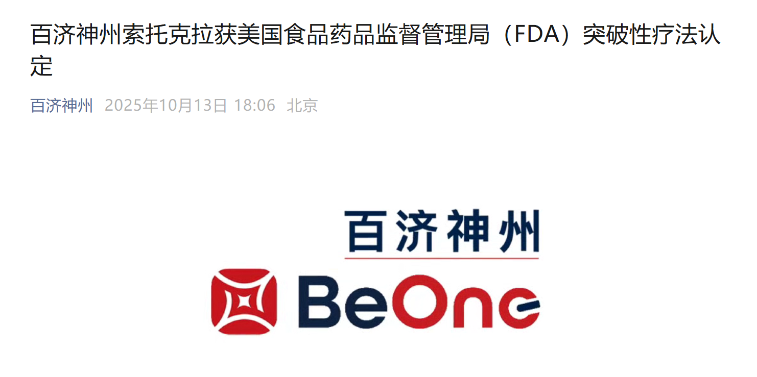10月13日,百济神州宣布,美国食品药品监督管理局(FDA)已授予索托克拉突破性疗法认定(BTD),用于治疗复发或难治性(R/R)套细胞淋巴瘤(MCL)成人患者。