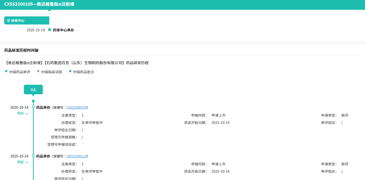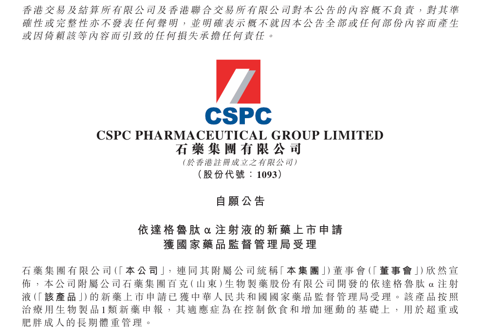 10月13日,石药集团宣布,该公司附属公司石药集团百克生物开发的依达格鲁肽α注射液的新药上市申请已获中国NMPA受理。该产品按照治疗用生物制品1类新药申报,其适应症为在控制饮食和增加运动的基础上,用于超重或肥胖成人的长期体重管理。