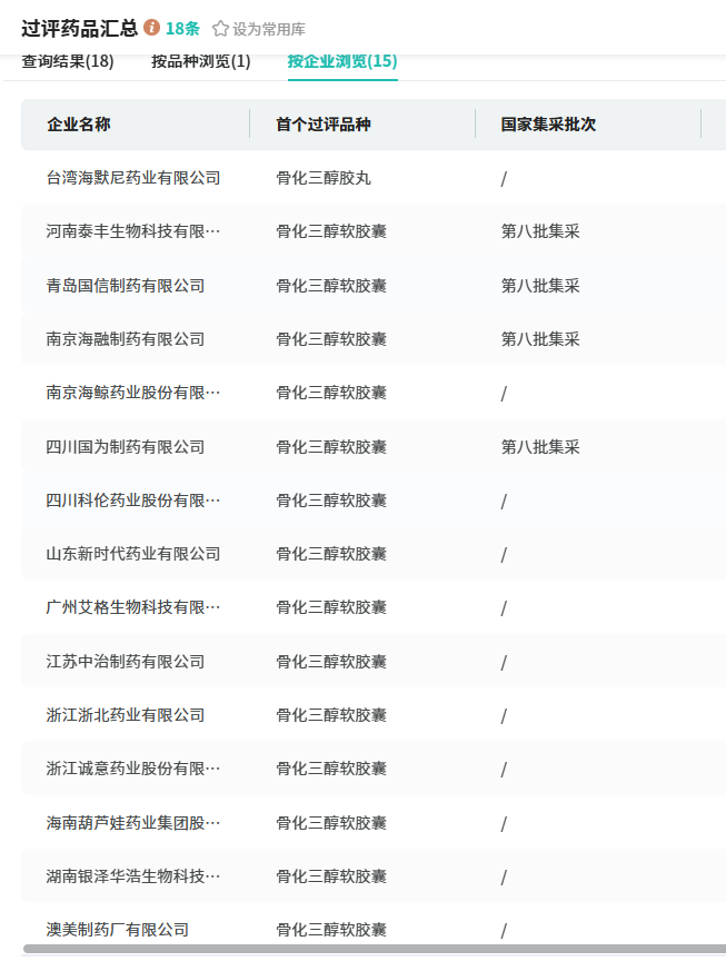 目前国内已上市的骨化三醇主要剂型包括胶囊、软膏、注射剂、口服溶液,其中胶囊剂为销售主力军,占比超过九成。据摩熵医药数据库显示,共有15家企业获生产批文且通过一致性评价,河南泰丰生物、青岛国信制药、南京海融制药、四川国为制药四家药企的骨化三醇软胶囊成功入选第八批集采。