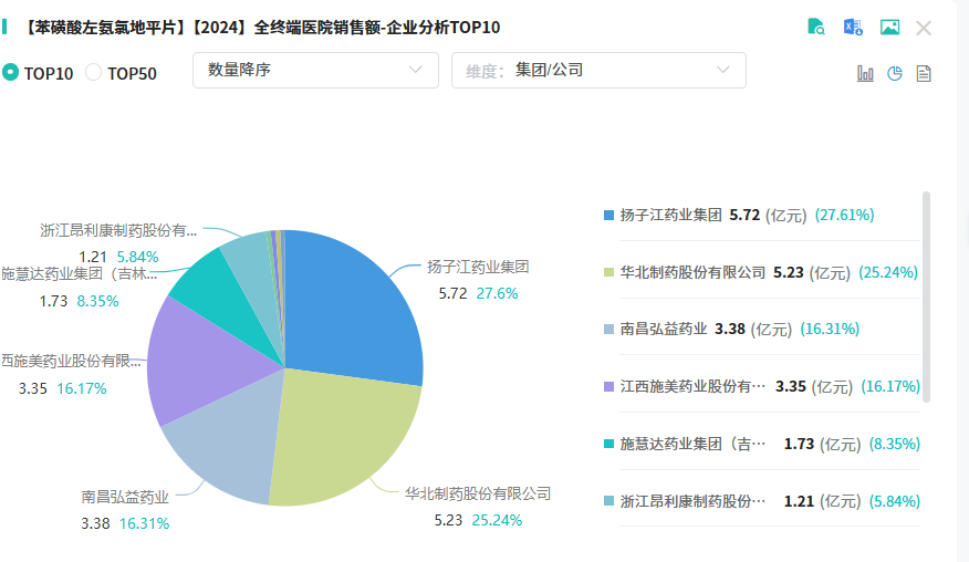从企业竞争格局分析,在2024年全终端医院市场中,苯磺酸左氨氯地平片呈现出三足鼎立的态势。其中,扬子江药业以27.61%的市场份额傲居榜首;华北制药紧随其后,占据25.24%的市场份额,位列第二;南昌弘益药业则以16.31%的市场份额位居第三。