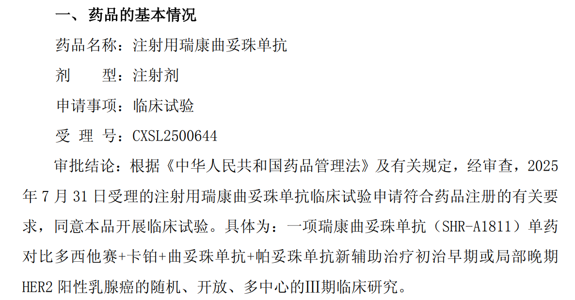 10月23日,恒瑞医药发布公告,其子公司苏州盛迪亚生物收到国家药监局核准签发关于注射用瑞康曲妥珠单抗的《药物临床试验批准通知书》,将于近期开展临床试验。具体为:一项瑞康曲妥珠单抗(SHR-A1811)单药对比多西他赛+卡铂+曲妥珠单抗+帕妥珠单抗新辅助治疗初治早期或局部晚期HER2 阳性乳腺癌的随机、开放、多中心的Ⅲ期临床研究。