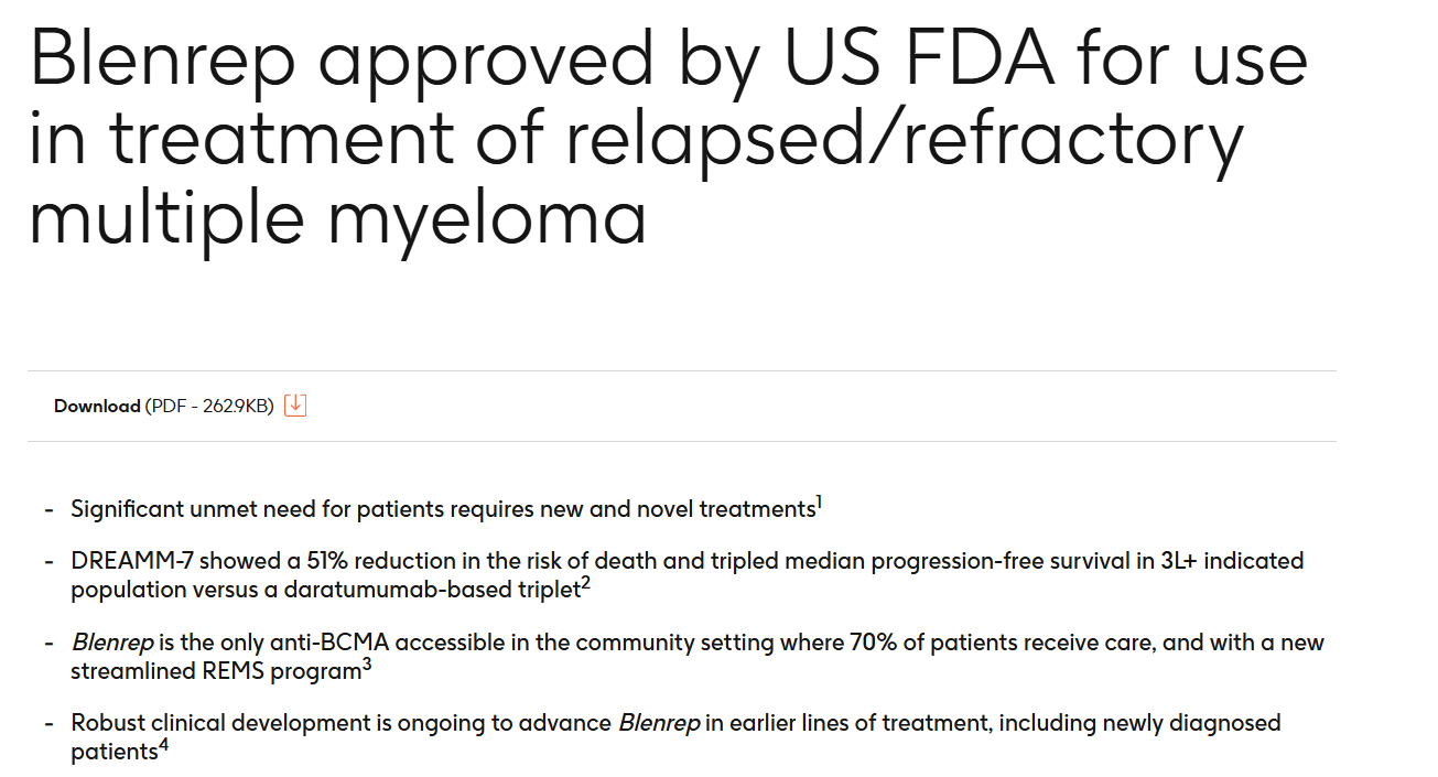 虽然首次上市失利,但Blenrep在后续研究 DREAMM-7 中,显示出积极的效果,终于在又获得 FDA 批准上市。