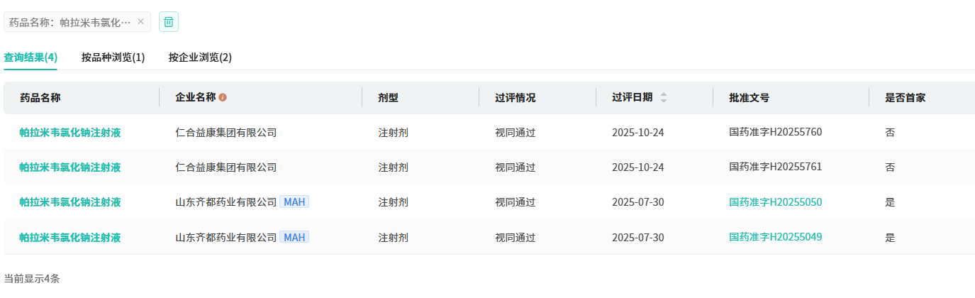 截至目前,帕拉米韦氯化钠注射液有石家庄四药、扬子江药业集团、山东华鲁制药等19家药企提交了4类仿制申请,均在审评审批中。2025年7月,齐都药业的帕拉米韦氯化钠注射液获批上市并视同过评,为国内首仿上市。此次,仁合益康获批并过评,拿下国产第2家。