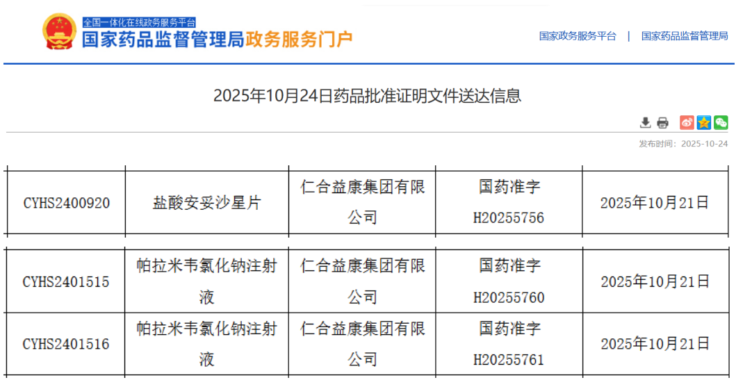 10月24日,据NMPA 官网最新公示,仁合益康集团以仿制4类报产的盐酸安妥沙星片和帕拉米韦氯化钠注射液两款品种同日获批并视同过评。