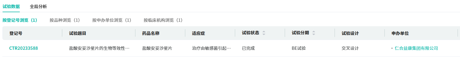 2007年1月安徽环球药业以1.1类新药获批生产。此前,暂无仿制药企获批。此次,仁合益康集团以仿制4类报产的盐酸安妥沙星片获批,拿下国内首仿。目前仁合益康集团完成了该品种的BE试验。