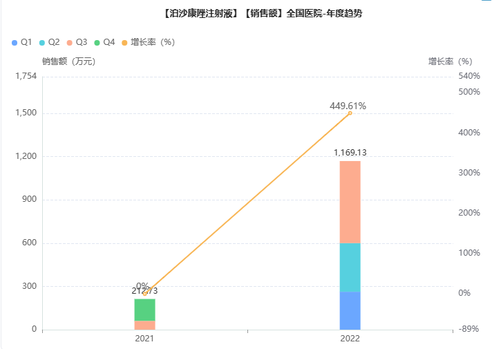 据摩熵医药(原药融云)数据库统计,默沙东的泊沙康唑在中国上市以来,销售额一路飙升,2021年泊沙康唑院内销售额突破3亿元,其中泊沙康唑口服混悬液为主要销售品种。泊沙康唑注射液虽不是主要销售品种,但市场也在快速增长中。据药融云数据,2022年前三季度,泊沙康唑注射液院内销售额突破一千万元,相较2021年总额增长450%。